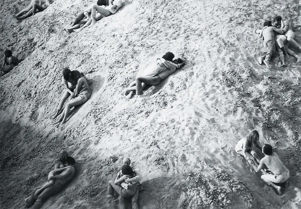 The temporal stretch of explosions is illustrated in two sequences in Michelangelo Antonioni’s, Zabriskie Point, a film set in the USA in the late 1960s. The first sequence [Bang: liberating, multiplied, pleasure] takes place when the female protagonist, Daria, and her counterpart, the maverick revolutionary, Mark, venture into the ancient riverbeds of Death Valley to consummate their adventure. Their coupling spawns numerous other pairings who appear copulating in the dust. Their sex is textured by cuts between their bodies and these associated figures. This birthing of multiples expresses the stretching sensation found in the explosion and this sensorial space (as well as being a political nod to the counterculture of free love). The sequence closes with an aerial shot of the couples strewn across the dunes, as if they are the fragments that have been flung from the explosion of Daria and Mark.